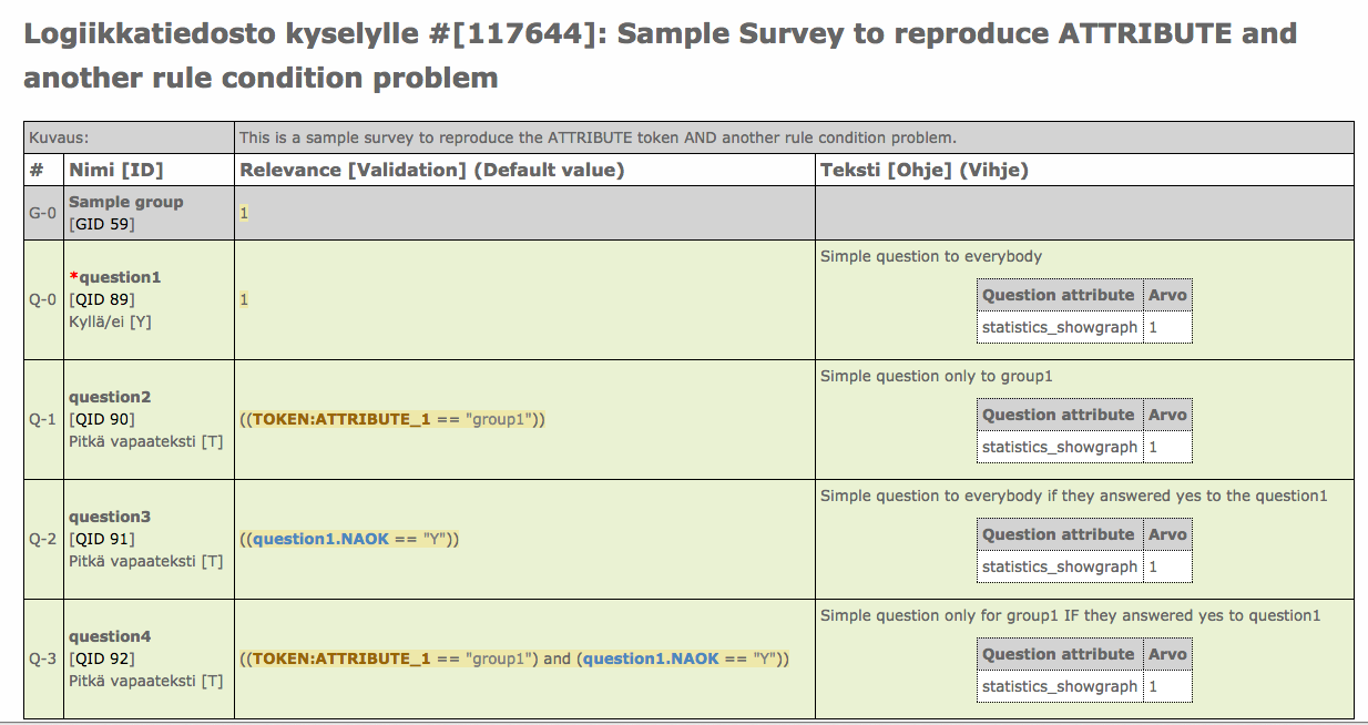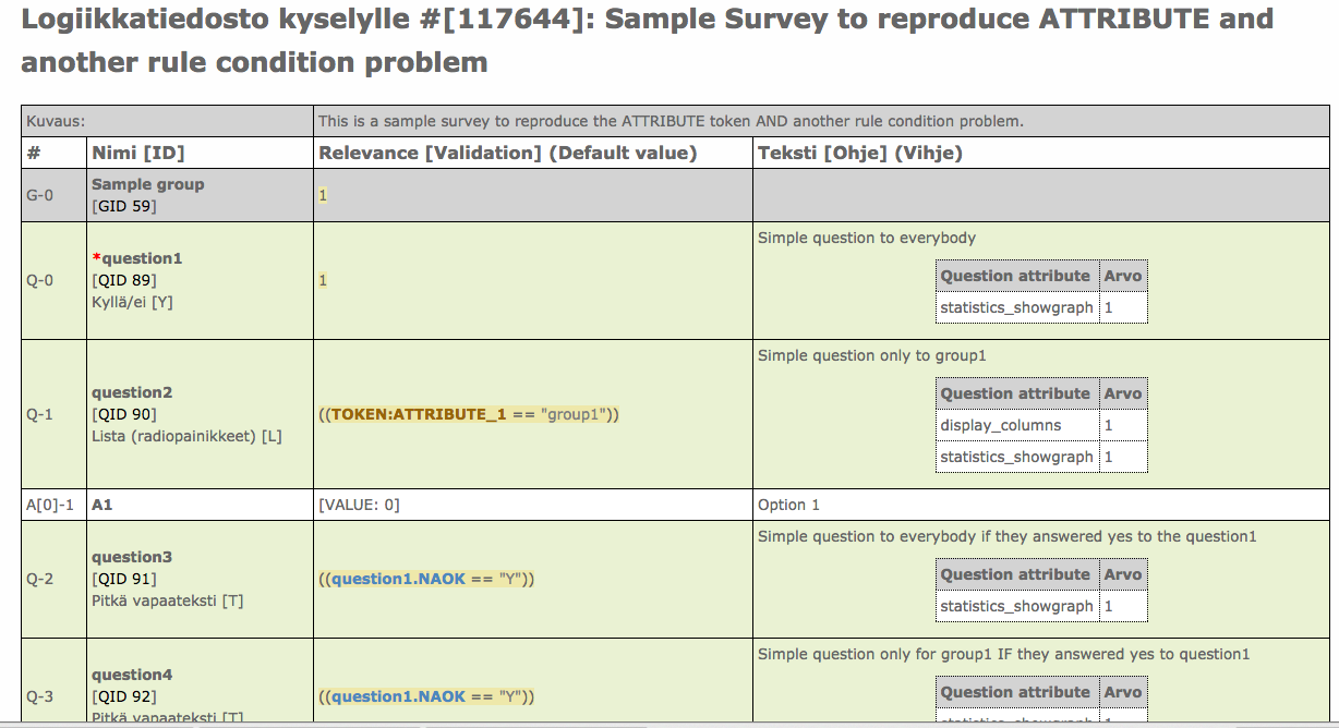 | Description | I want to predefine the groups using ATTRIBUTE_1 as group designator. If I create a condition that a question should be shown only if user is in group1 AND answered a previous question Yes the condition is created OK. If I then edit a question that is not related to that rule the ATTRIBUTE condition gets removed. Also, if I export the survey and re-import it and create the tokens table the condition is removed. | ||||