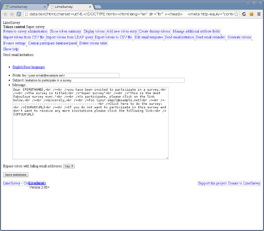 | Description | After the changes made in https://github.com/LimeSurvey/LimeSurvey/commit/5b64dba8f1b8ed99954df3357e57bb4c4cf82213 to fix issue 09358, the mail sending popup/new window on the tokens page is not working anmyore. (I tested it with Chromium 37, Chrome 39, Iceweasel 31 (Iceweasel=Firefox)) Results are as in the attached screenshot. "data:text/html;charset=utf-8,.." appears in the location bar, the rest of the page is not rendered correctly in Chrome, in Iceweasel/Firefox the page is blank (source code is cut off at the first '#' in a href). Works fine again when undoing the changes. | ||||
