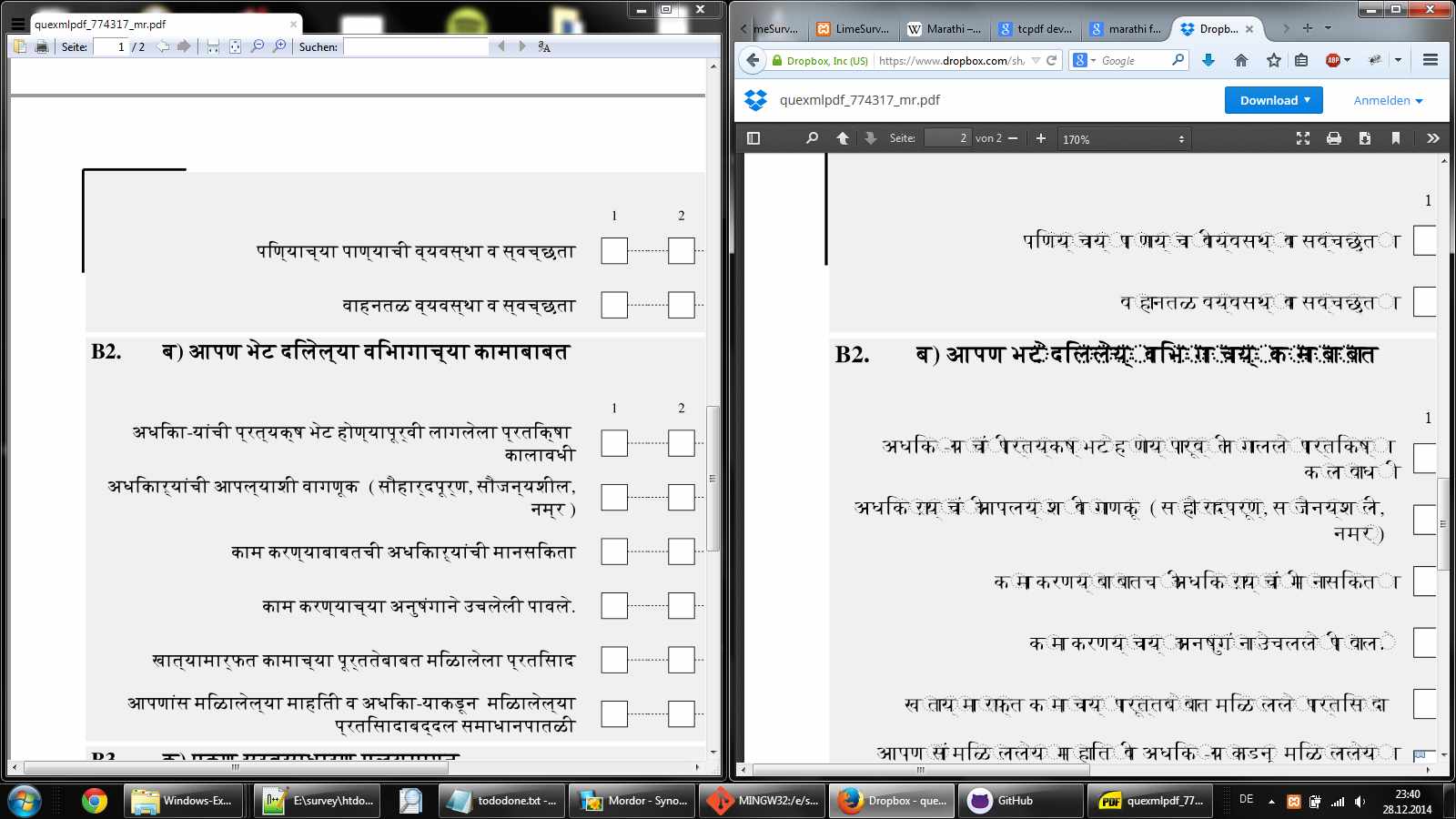 In Dropbox folder : https://www.dropbox.com/sh/mc49f1v6tfz7c62/AAAYYxABGo9T4XHHHq89gHrHa?dl=0 I am not sure if its client side rendering problem or way limesurvey is generating the pdf during quexml export. |