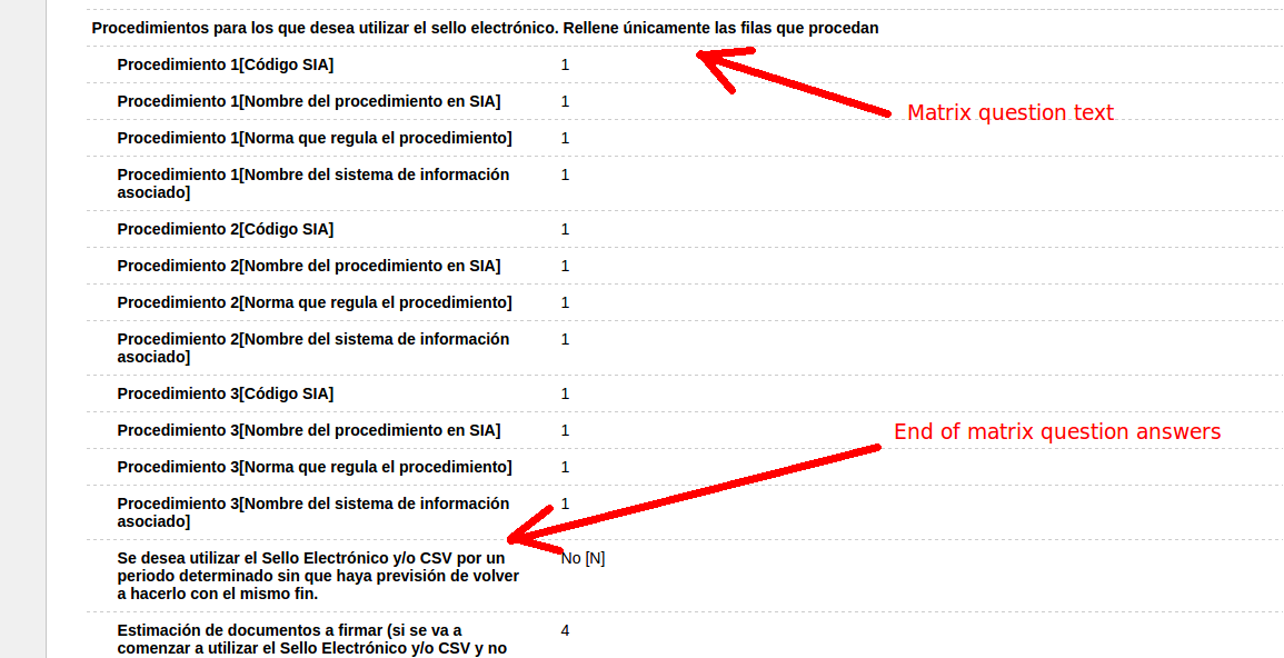 | Additional Information | I propose removing the text of the matrix question as title and make it part of every row. This is the way it is done currently when exporting answers to PDF from admin gui. | ||||