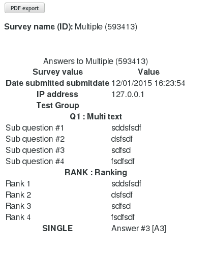 <!DOCTYPE html PUBLIC "-//W3C//DTD XHTML 1.0 Transitional//EN" "http://www.w3.org/TR/xhtml1/DTD/xhtml1-transitional.dtd"> <html xmlns="http://www.w3.org/1999/xhtml" xml:lang="en" lang="en"><head> <meta http-equiv="content-type" content="text/html; charset=UTF-8"> <meta http-equiv="X-UA-Compatible" content="IE=edge"> </head> <body class="default lang-en groupbygroup showprogress showqnumcode-X"> <form action="" method="post"> <div style="display:none"><input value="59cfc8013715e505a919a1be710859d14a247930" name="YII_CSRF_TOKEN" type="hidden"></div> <p class="button"> <input value="PDF export" id="exportbutton" type="submit"> <input name="printableexport" type="hidden"> </p></form> <div class="printouttitle"><strong>Survey name (ID):</strong> Multiple (593413)</div><p> </p> <table class="printouttable"> <caption class='hide'>Answers to Multiple (593413)</caption> <thead class='hide tableheader'><tr><th scope="col">Survey value</th><th scope="col">Value</th></tr></thead> <tbody> <tr class="printanswersquestion"><th>Date submitted submitdate</th><td class="printanswersanswertext">12/01/2015 16:23:54</td></tr> <tr class="printanswersquestion"><th>IP address </td><td class="printanswersanswertext">127.0.0.1</td></tr> </tbody> <thead class='printanswersgroup'><tr ><th colspan="2">Test Group</th></tr></thead> <tbody class="group"> <tr class="printanswersquestion"><th colspan="2">Q1 : Multi text</th></tr> <tr class="printanswerssubquestion"><td>Sub question #1</td><td class="printanswersanswertext">sddsfsdf</td></tr> <tr class="printanswerssubquestion"><td>Sub question #2</td><td class="printanswersanswertext">dsfsdf</td></tr> <tr class="printanswerssubquestion"><td>Sub question #3</td><td class="printanswersanswertext">sdfsd</td></tr> <tr class="printanswerssubquestion"><td>Sub question #4</td><td class="printanswersanswertext">fsdfsdf</td></tr> <tr class="printanswersquestion"><th colspan="2">RANK : Ranking</th></tr> <tr class="printanswerssubquestion"><td>Rank 1</td><td class="printanswersanswertext">sddsfsdf</td></tr> <tr class="printanswerssubquestion"><td>Rank 2</td><td class="printanswersanswertext">dsfsdf</td></tr> <tr class="printanswerssubquestion"><td>Rank 3</td><td class="printanswersanswertext">sdfsd</td></tr> <tr class="printanswerssubquestion"><td>Rank 4</td><td class="printanswersanswertext">fsdfsdf</td></tr> <tr class="printanswersquestion"><th>SINGLE </th><td class="printanswersanswertext">Answer #3 [A3]</td></tr> </tbody> </table> </body></html> | ||||