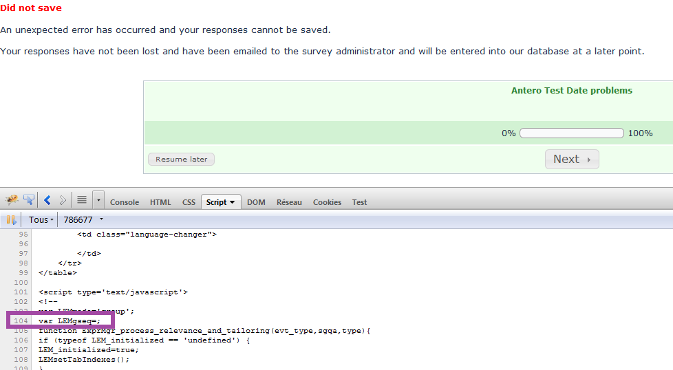 Error executing query in dbExecuteAssoc:CDbCommand failed to execute the SQL statement: SQLSTATE[0A000]: Feature not supported: 7 ERREUR: la valeur date/time � INVALID � n'est plus support�e LINE 1: ...11:55:20', "ipaddr"='172.24.32.129', "786677X1X1"='INVALID' ... ^. The SQL statement executed was: UPDATE lime_survey_786677 SET "lastpage"=0, "datestamp"='2015-11-19 11:55:20', "ipaddr"='172.24.32.129', "786677X1X1"='INVALID' WHERE ID=25
