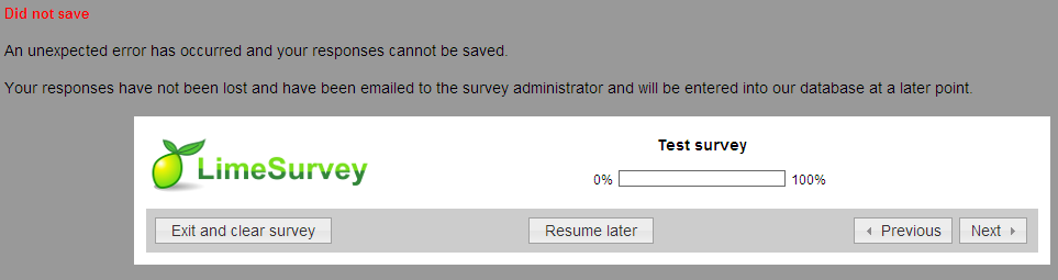 Did not save An unexpected error has occurred and your responses cannot be saved. Your responses have not been lost and have been emailed to the survey administrator and will be entered into our database at a later point. The administrator of the survey receives an email with the token that caused the error and the codes of questions and responses introduced. | ||||