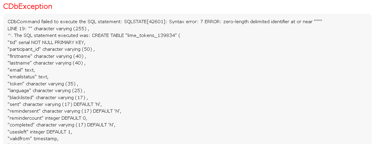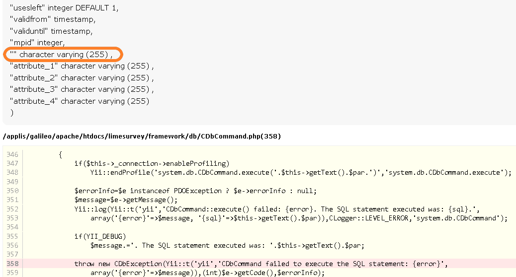 | Description | I get an error which I can not determine the origin. Once the questionnaire has been disabled then duplicated as a model for a new questionnaire. The problem is in the re-creation of the invitation table, a SQL error occurs. I added the survey. I managed to break the deadlock by changing the content of .lss file: I wanted to try on the limesurvey demo server, but automatic connection (prefilled login and password) does not. In the screenshot 2, there is a integration with an empty field type caracter varying, 255 suspicious ... | ||||