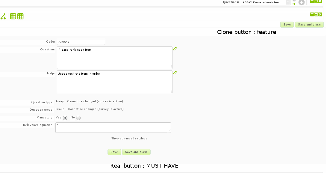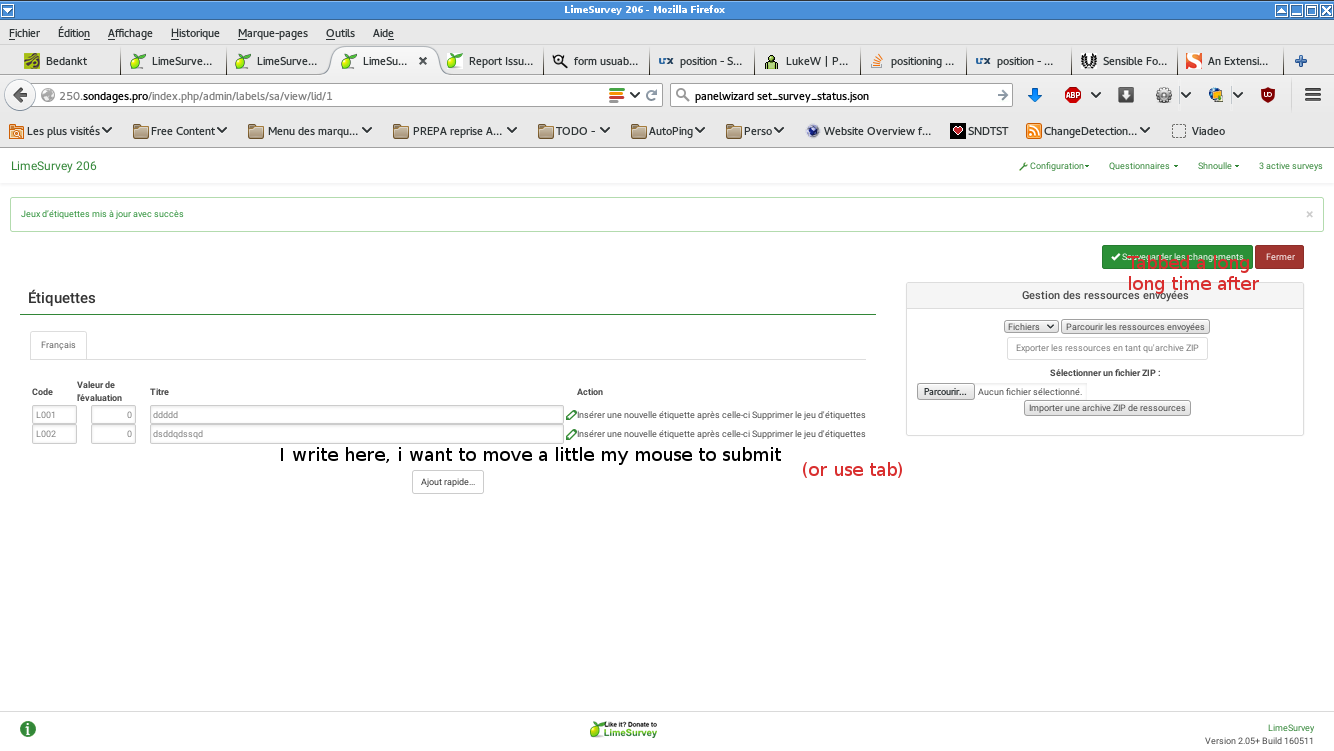 A lot of our user use tab to edit quickly question/sub questions/answers The actual solution is not best : for example , with tab : Move to "Quick add" before 3Save" , but it's better | ||||