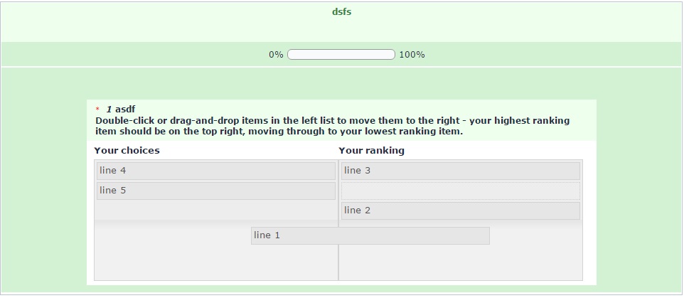 | Description | When using ranking question type, items cannot be dragged directly into bottom position. This is old jQuery version, I think latest LS using newer version. But still have this problem. I think all the built-in templates have this problem. See link below: The only template doesn't have this problem is Default Reloaded Can we fix all the built-in templates? | ||||