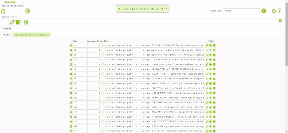 | Description | Hi guys, I'm trying to activate spanish on my label sets from "label set Administration". I choose one in this case "services", then I try to select spanish (Mexico) But cant get it to add it. Right now my survey show english answer options in english regardless of the chosen language. Of course that's not useful for me. Is there anyway to make this work? As this takes away the utility of the languages feature I think is critical. Thank you very much for your help. | ||||